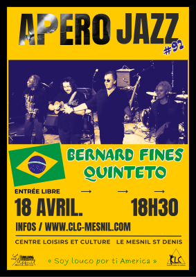 Musicien français ayant vécu plus de 20 ans au Brésil, Bernard Fines mêle jazz et musiques brésiliennes pour un concert accessible et chaleureux. Habitué de scènes parisiennes reconnues comme le Studio de l’Ermitage ou le Sunside, il se produit au CLC en quintet pour une soirée exceptionnelle pleine de rythme et d’émot , ... - 19Répar’café #714h00 - 17h00