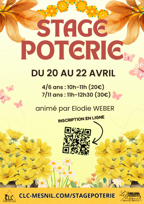 STAGE de POTERIE animé par Elodie WEBER du 20 au 22 Avril! Enfants de 4 à 6 ans 10h-11h (20€) / de 7 à 11 ans 11h-12h30 (30€) , ...Stage de PILATES vacances de printemps18h00 - 0h00
