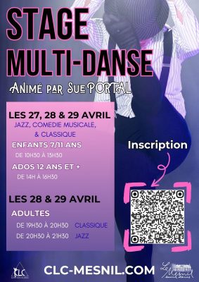 Sue nous fais le plaisir de revenir transmettre au CLC ! Les enfants et ados aborderont la danse jazz, la comédie musicale et classique. Les adultes; le jazz et le classique. Inscription via ce lien : https://www.helloasso.com/associations/centre-loisirs-et-culture/evenements/stages-multi-danse-sue-portal , ... - 29Stage Multi-danse0h00 - 21h30